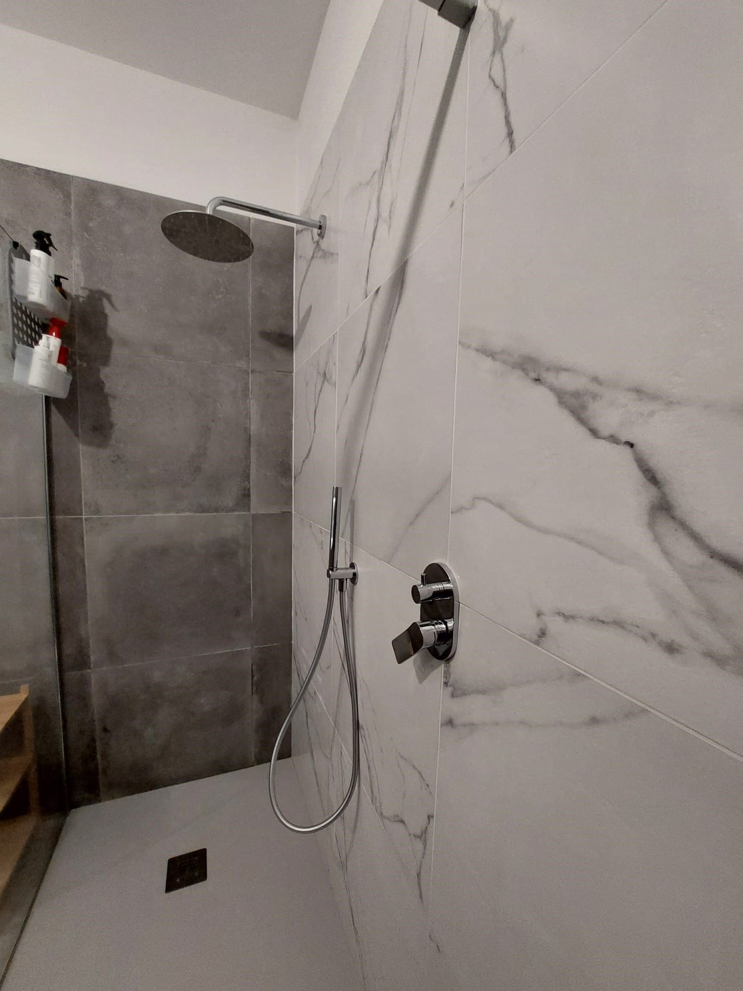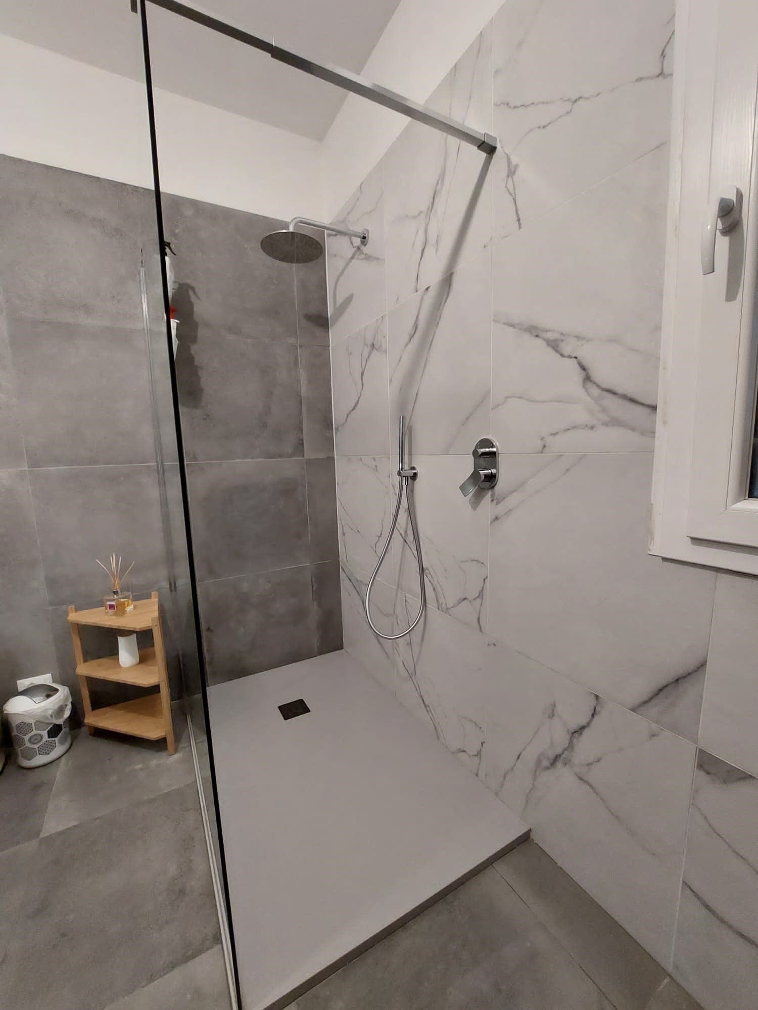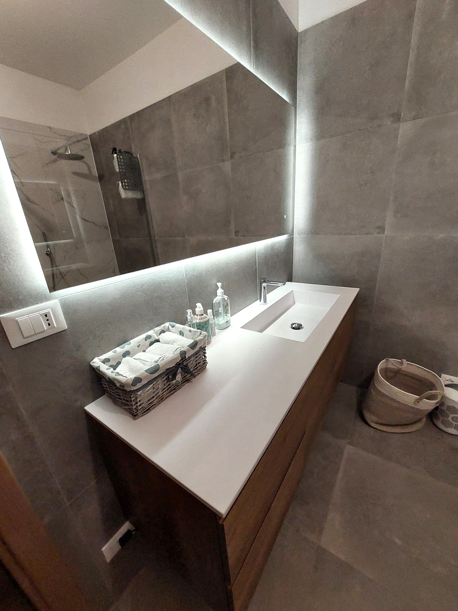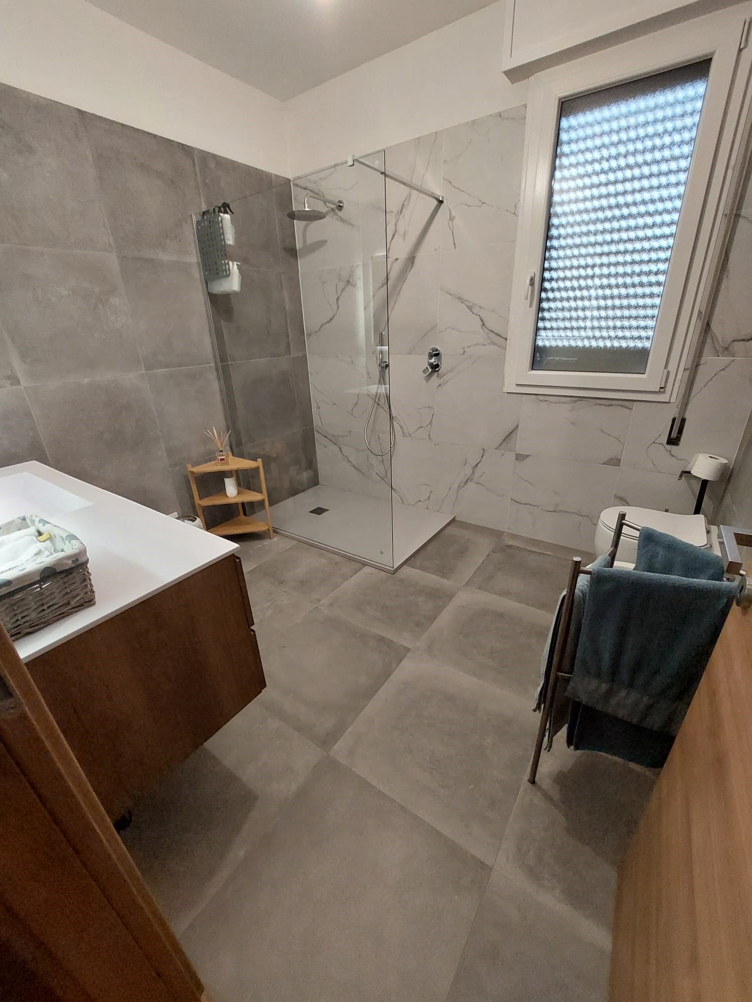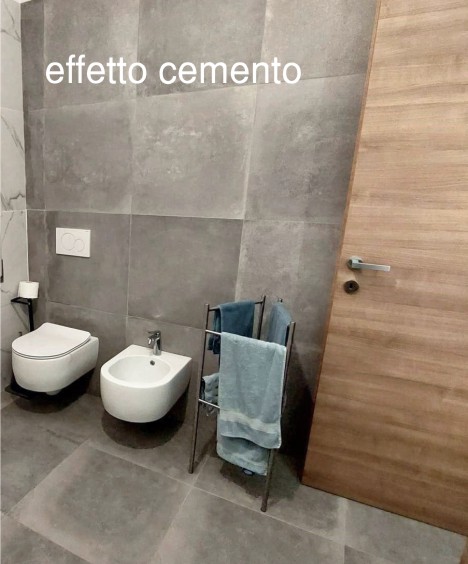Grazie ai pavimenti e rivestimenti in gres porcellanato con finiture cemento e marmo, il bagno si è trasformato in un ambiente "familiare". L'accostamento delle differenti superfici materiche - cemento e marmo - sono state un mix perfetto per creare un effetto unico e contemporaneo.