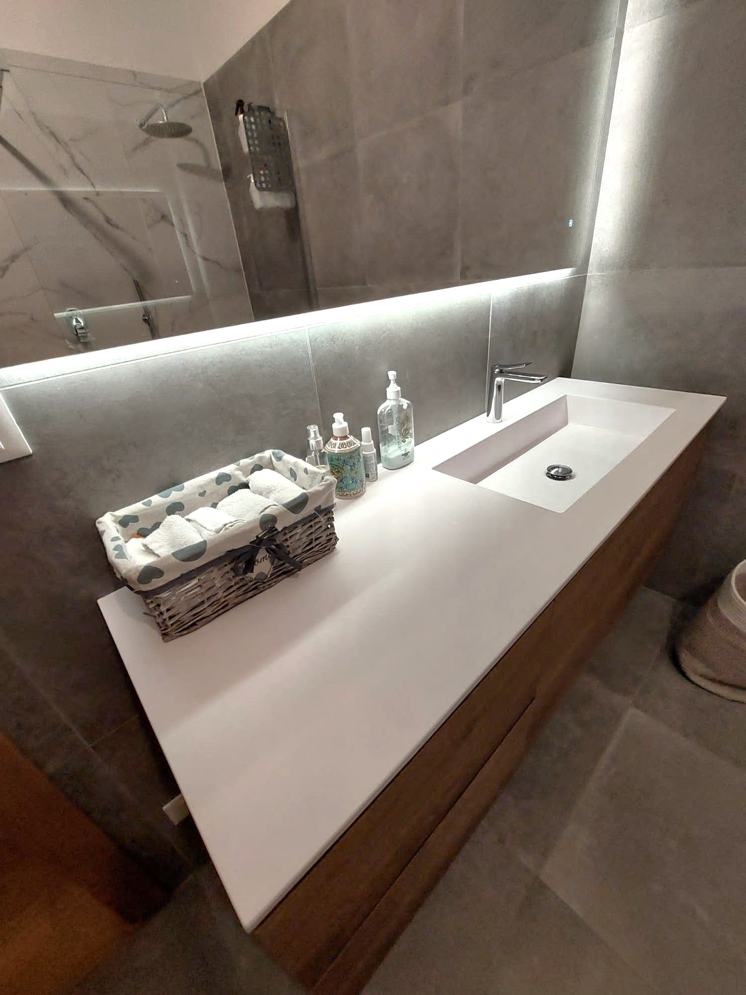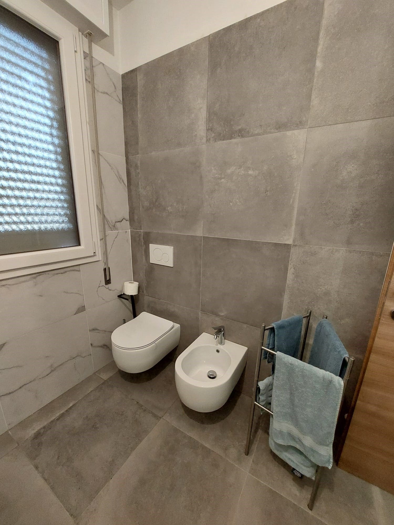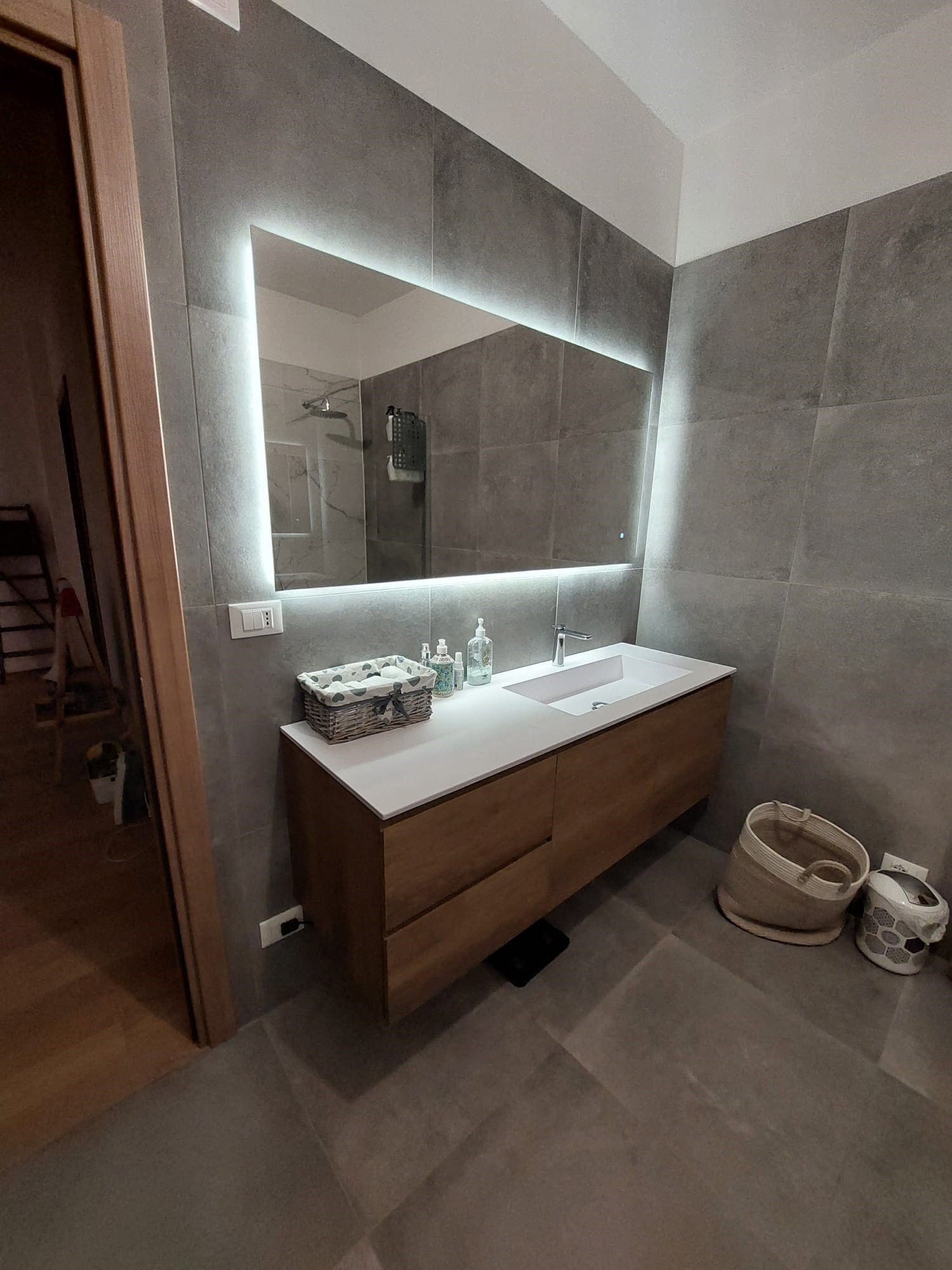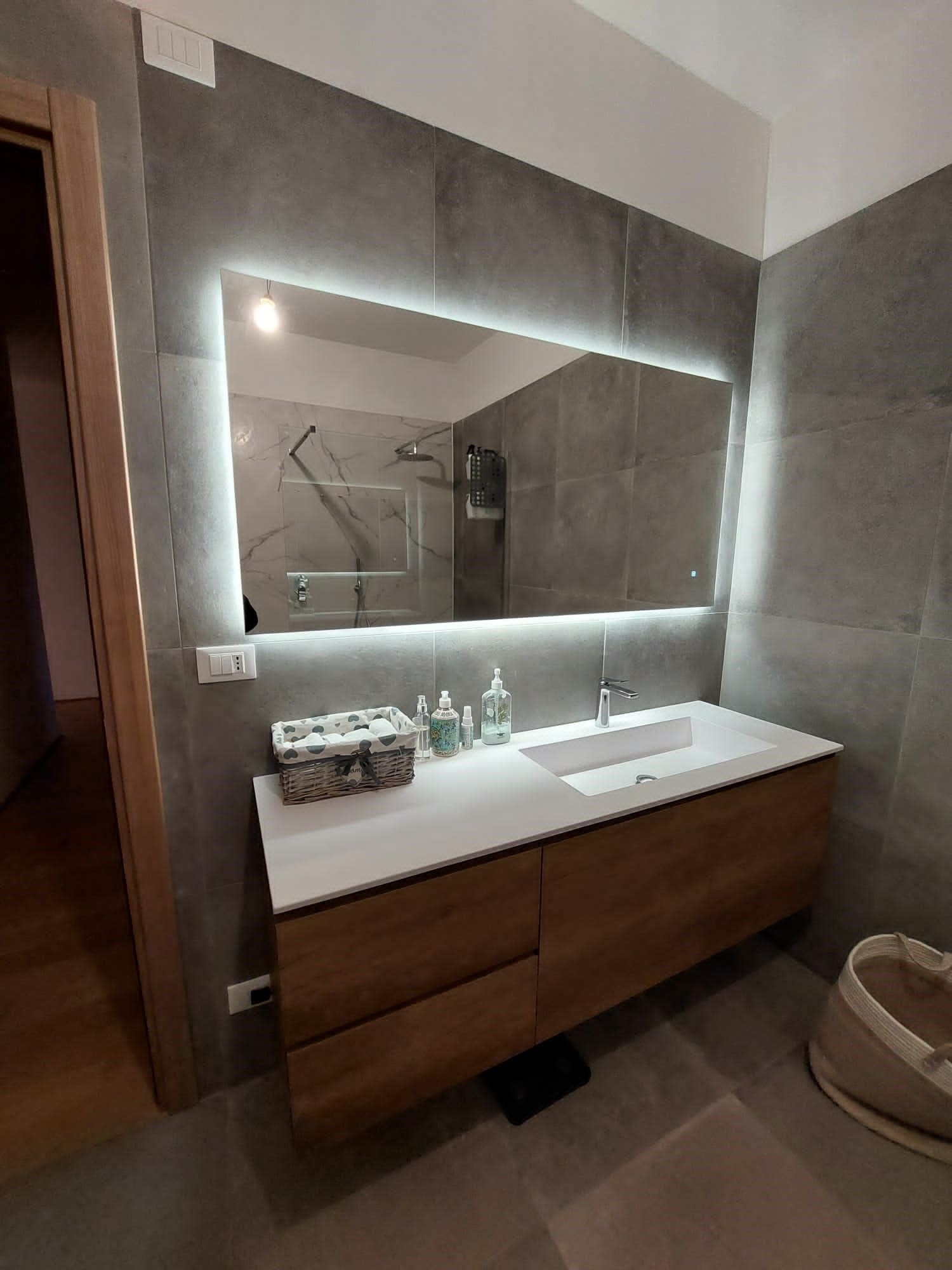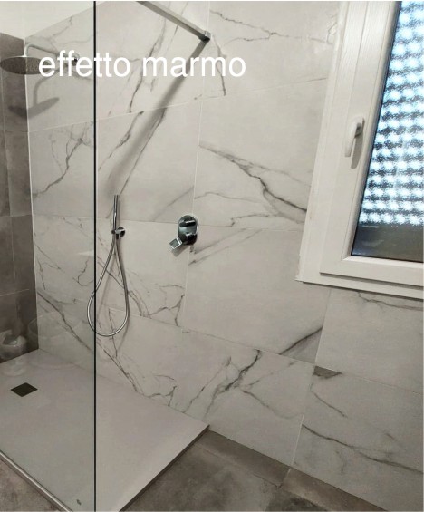 Grazie ai pavimenti e rivestimenti in gres porcellanato con finiture cemento e marmo, il bagno si è trasformato in un ambiente "familiare". L'accostamento delle differenti superfici materiche - cemento e marmo - sono state un mix perfetto per creare un effetto unico e contemporaneo.