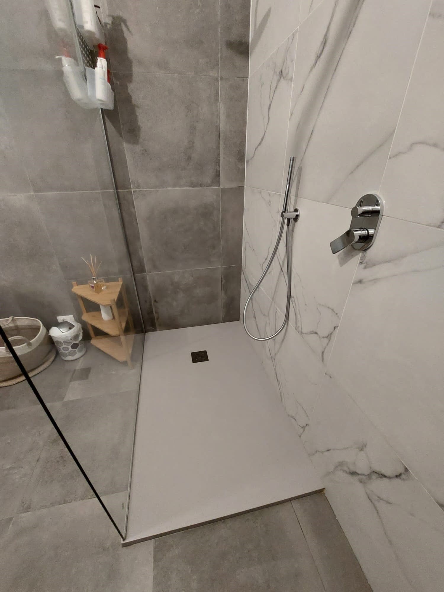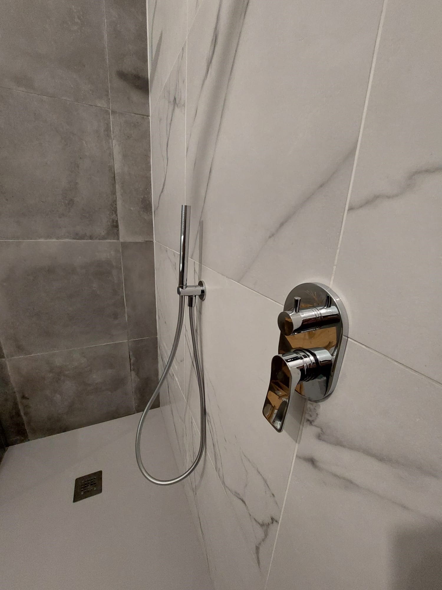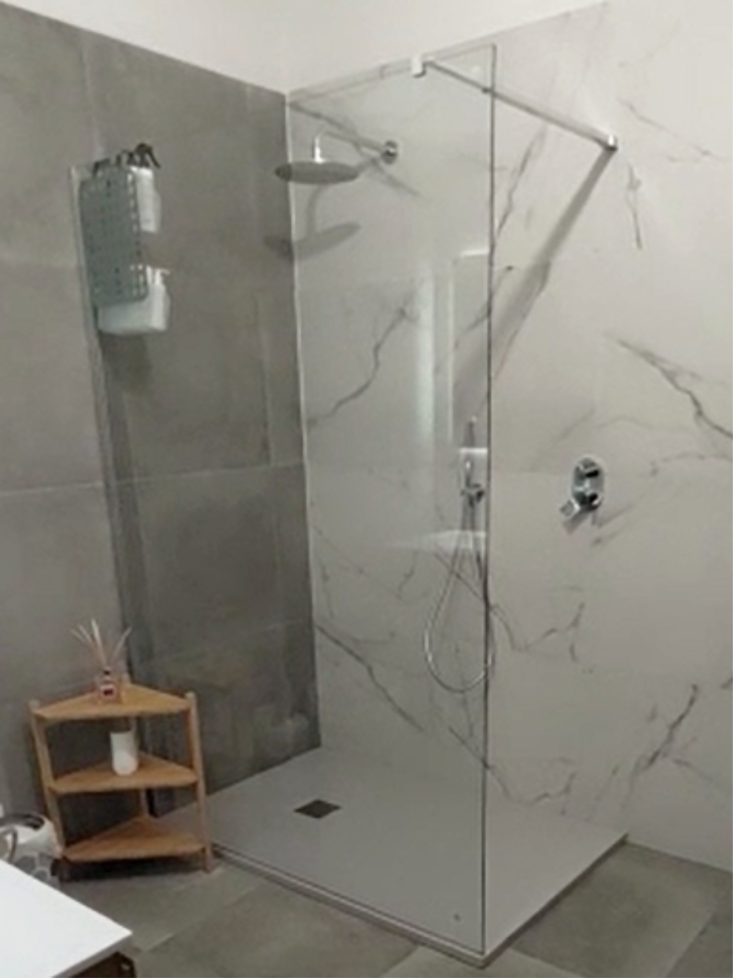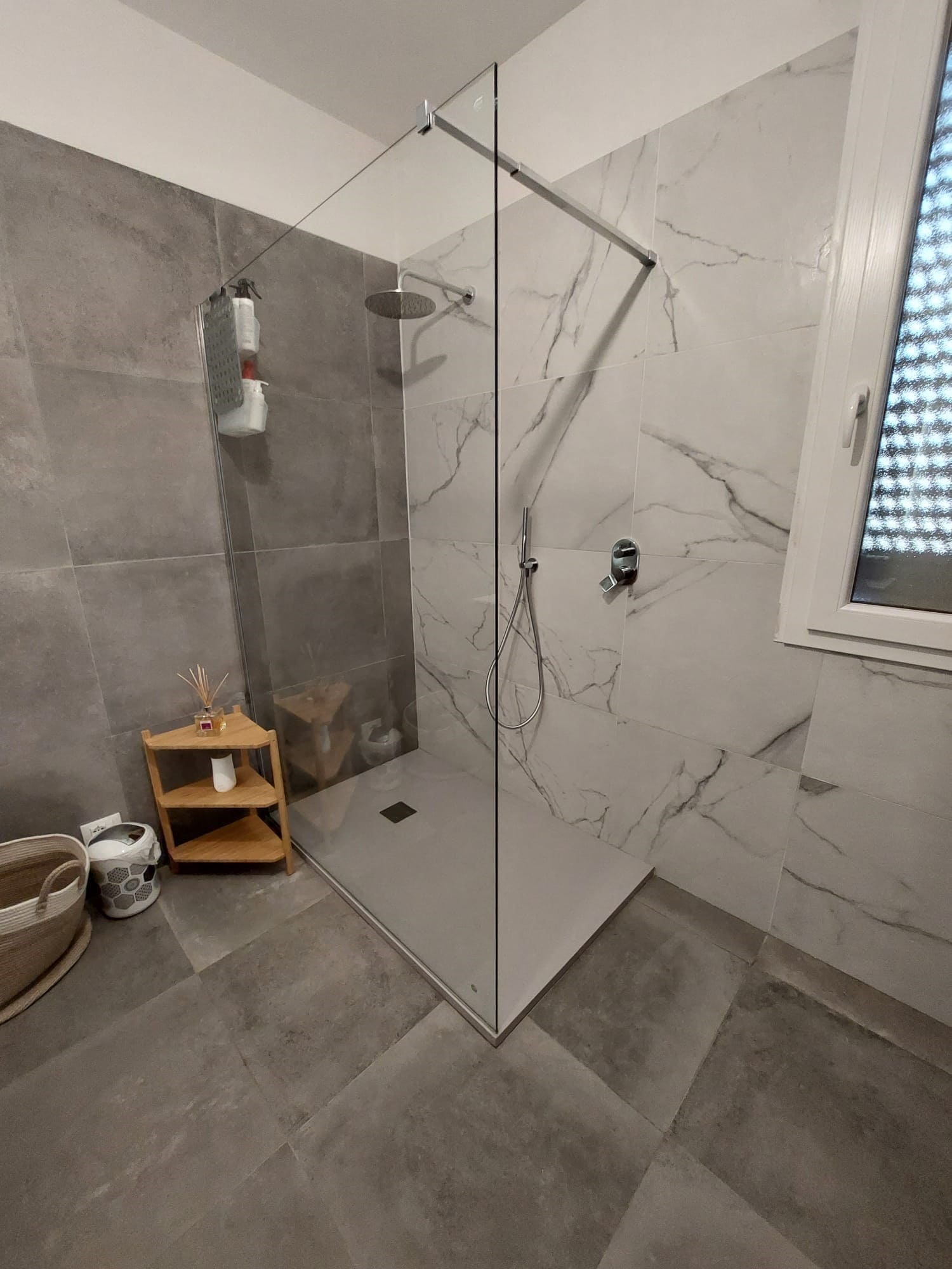 Grazie ai pavimenti e rivestimenti in gres porcellanato con finiture cemento e marmo, il bagno si è trasformato in un ambiente "familiare". L'accostamento delle differenti superfici materiche - cemento e marmo - sono state un mix perfetto per creare un effetto unico e contemporaneo.