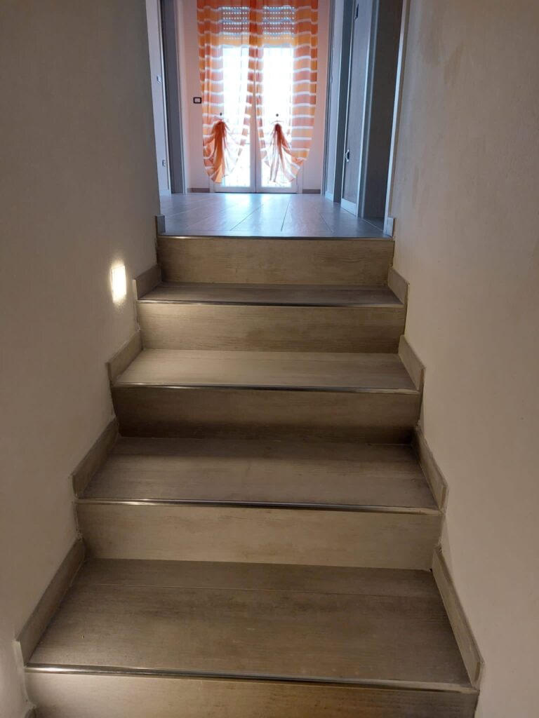 La scala che porta al piano superiore, mantiene anch'essa le caratteristiche del resto della pavimentazione in gres porcellanato effetto legno, ed è impreziosita da profili in acciaio inox.